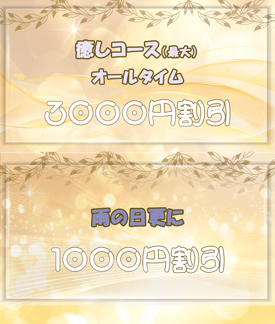 仕事仲間との付き合いなどでストレスや疲労を抱えている方も多いはず・・当店では、何の 気兼ねなくセラピストに身を委ねるだけで気持ち良くなれますので、施術後はすっきりして疲れやストレスがなくなります!!楽しい会話で気持ちもとっても軽 くなって悩みなどなくなってしまいますよ